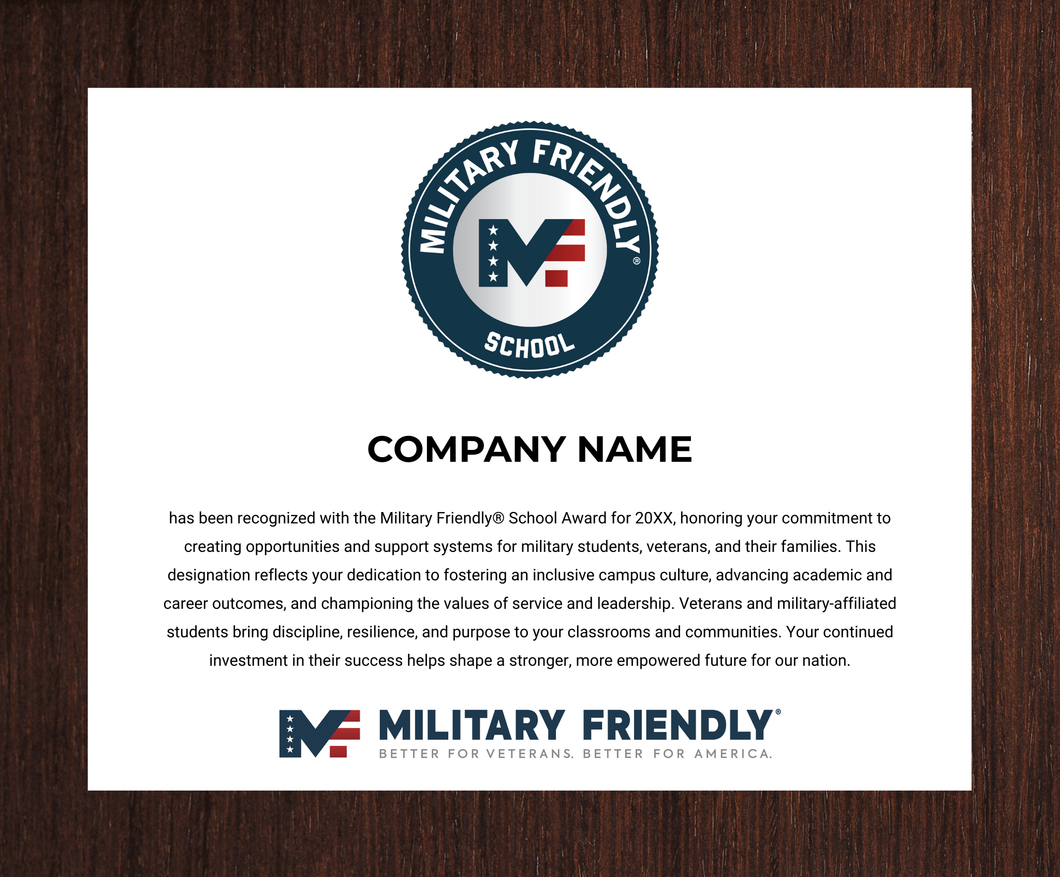 Institutions recognized with a Military Friendly® School Designation or Award are eligible to purchase a commemorative plaque to showcase their annual achievement. Each plaque can be customized with the institution’s name and the specific designation or award received for the selected year. Please ensure someone is available to receive the shipment at the provided delivery address during checkout. This plaque serves as a lasting symbol of your commitment to supporting military students and fostering a culture of inclusion, access, and academic excellence.
